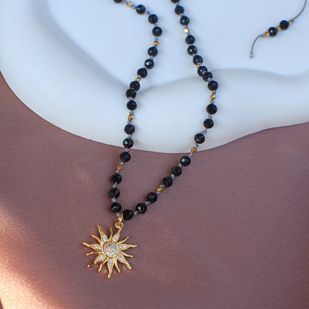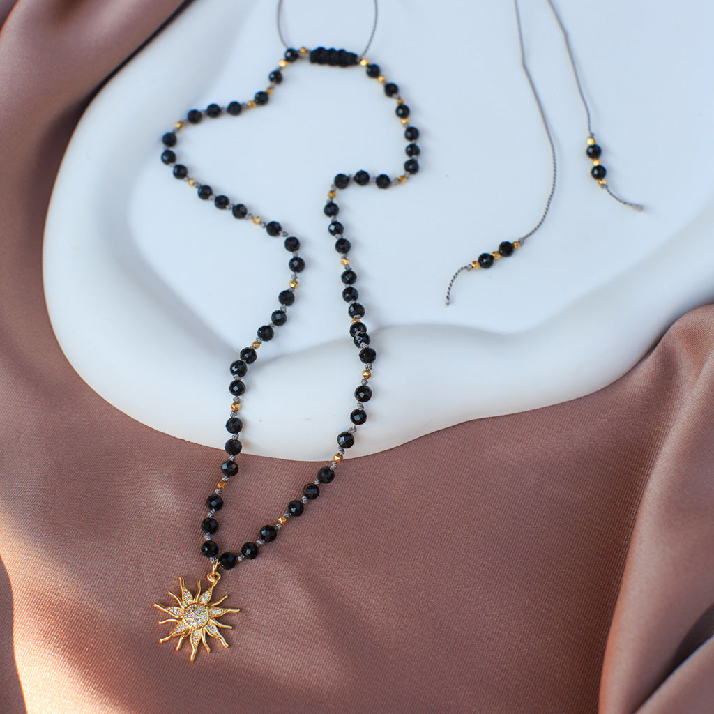Subtelny, a jednocześnie pełen mocy — naszyjnik wykonany z delikatnej nici jedwabnej w odcieniu szarości, ozdobiony czarnymi turmalinami, złotymi hematytami i zawieszką w kształcie gwiazdy.