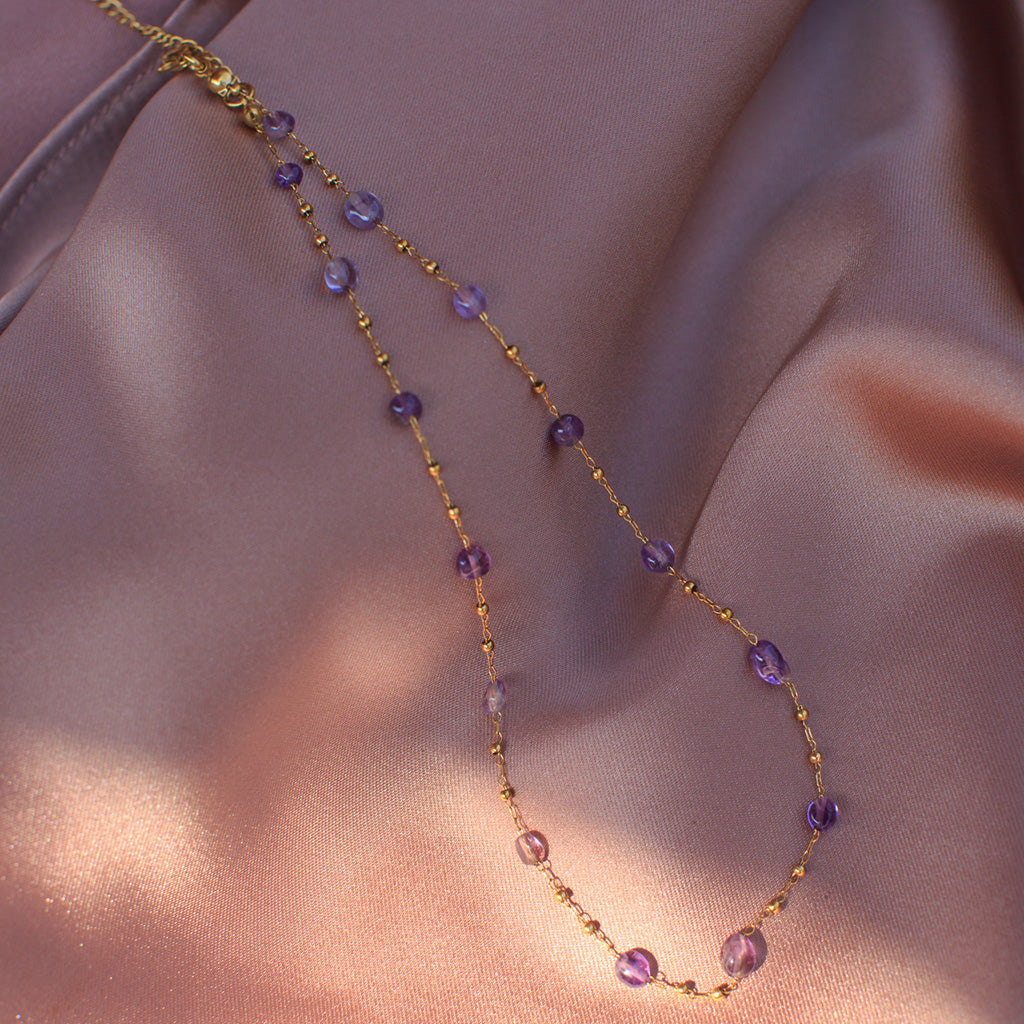 Zanurz się w odcieniach fioletu, które od wieków symbolizują spokój, mądrość i dobrą energię. Ten naszyjnik został stworzony z nieregularnych kamieni ametystu – każdy z nich ma swój własny kształt, fakturę i duszę. Przeplatają się z drobnymi kuleczkami w kolorze zlota, które dodają całości elegancji i lekkości.
