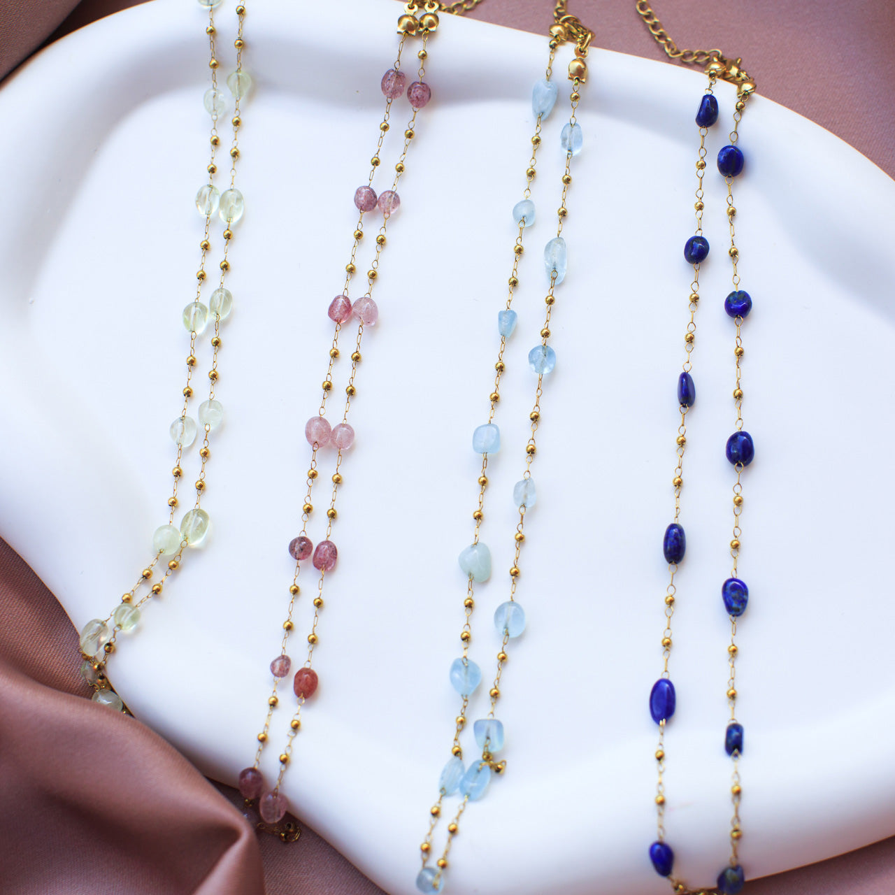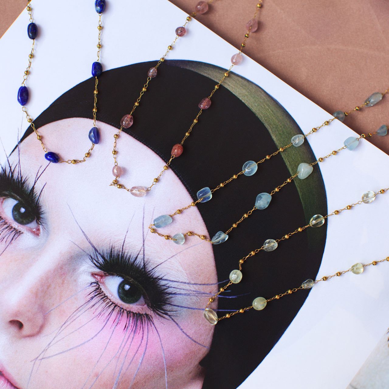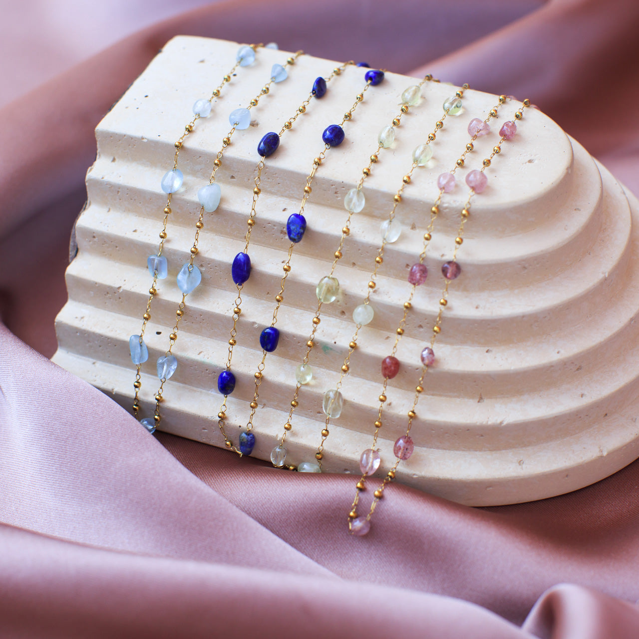 Ten naszyjnik z akwamarynu to jak zanurzenie się w spokojnej toni oceanu. Kamień syren i morskich czarodziejek, od wieków kojarzony z odwagą, harmonią i jasnością serca. Jego chłodny, błękitny odcień działa kojąco – jak letnia bryza na skórze. Subtelny, ale pełen głębi.