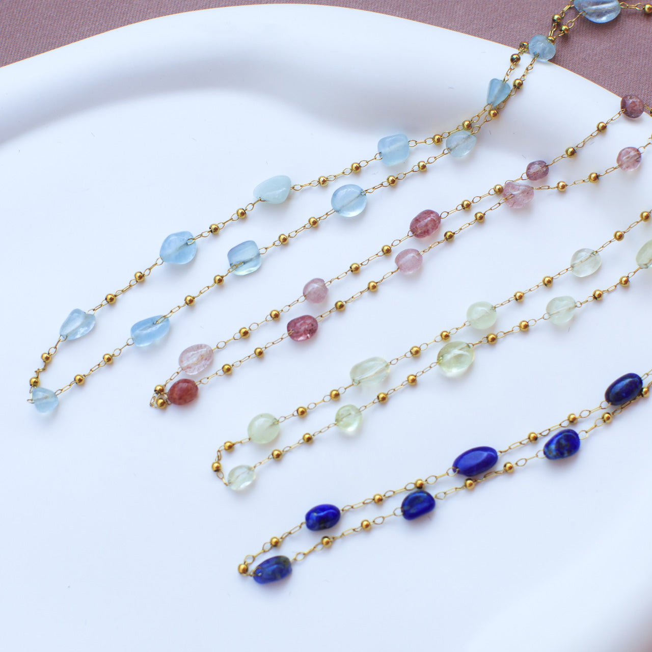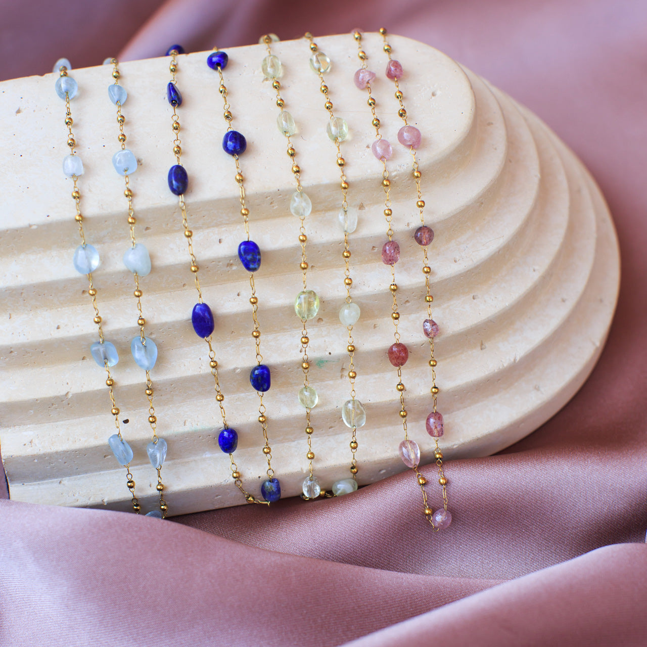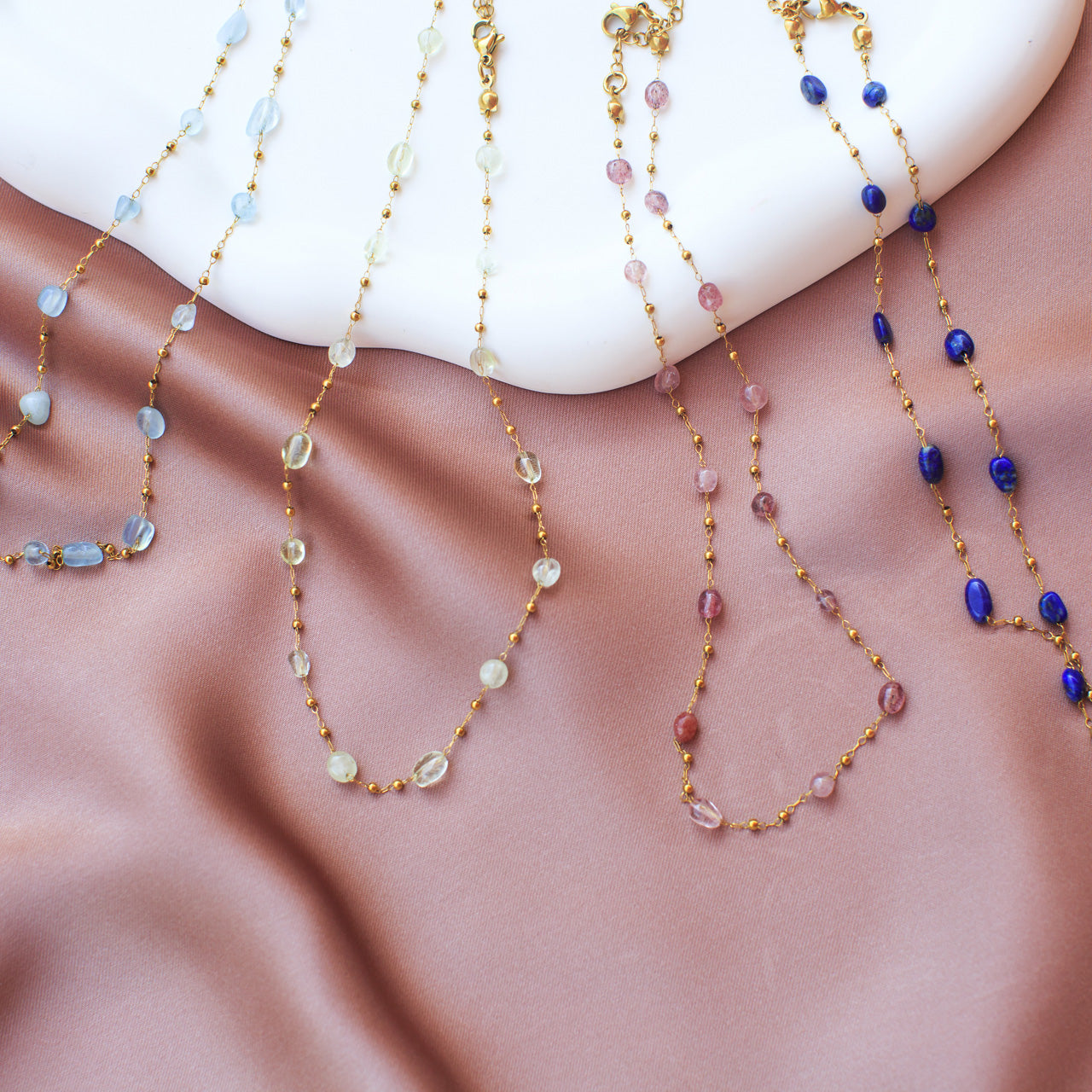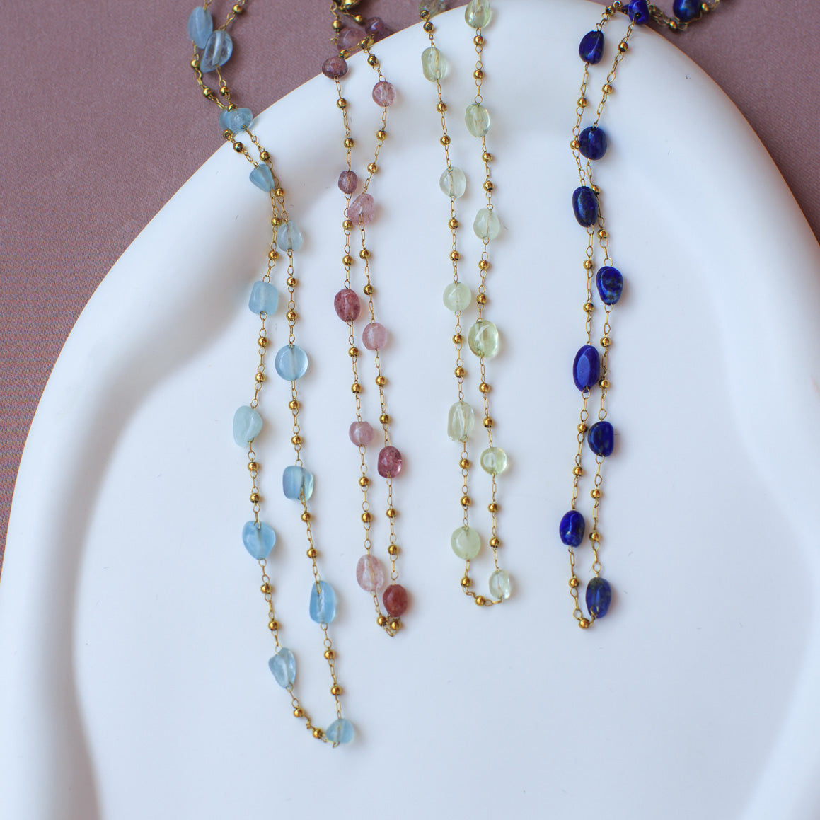 Ten naszyjnik z akwamarynu to jak zanurzenie się w spokojnej toni oceanu. Kamień syren i morskich czarodziejek, od wieków kojarzony z odwagą, harmonią i jasnością serca. Jego chłodny, błękitny odcień działa kojąco – jak letnia bryza na skórze. Subtelny, ale pełen głębi.