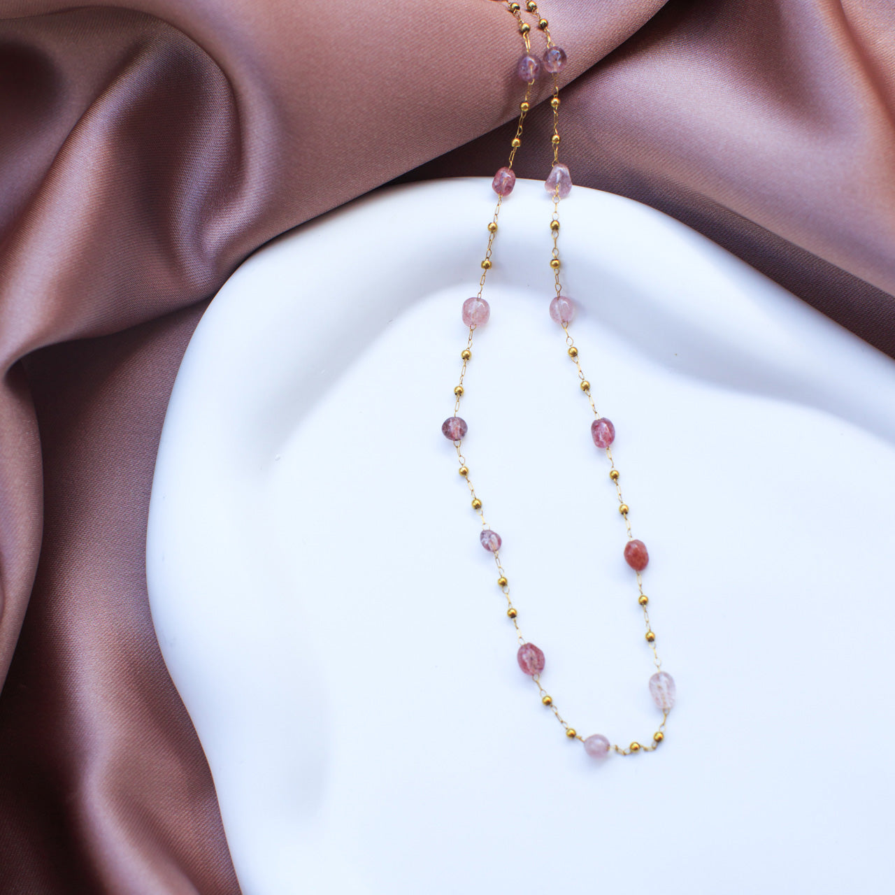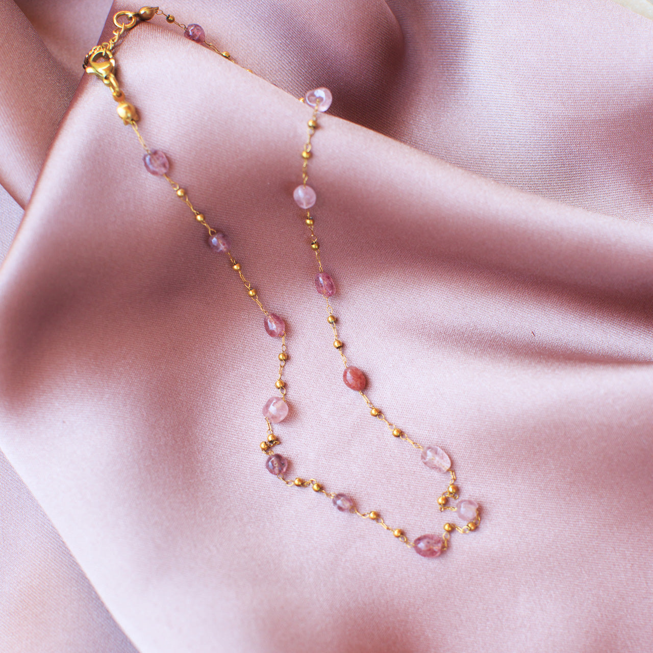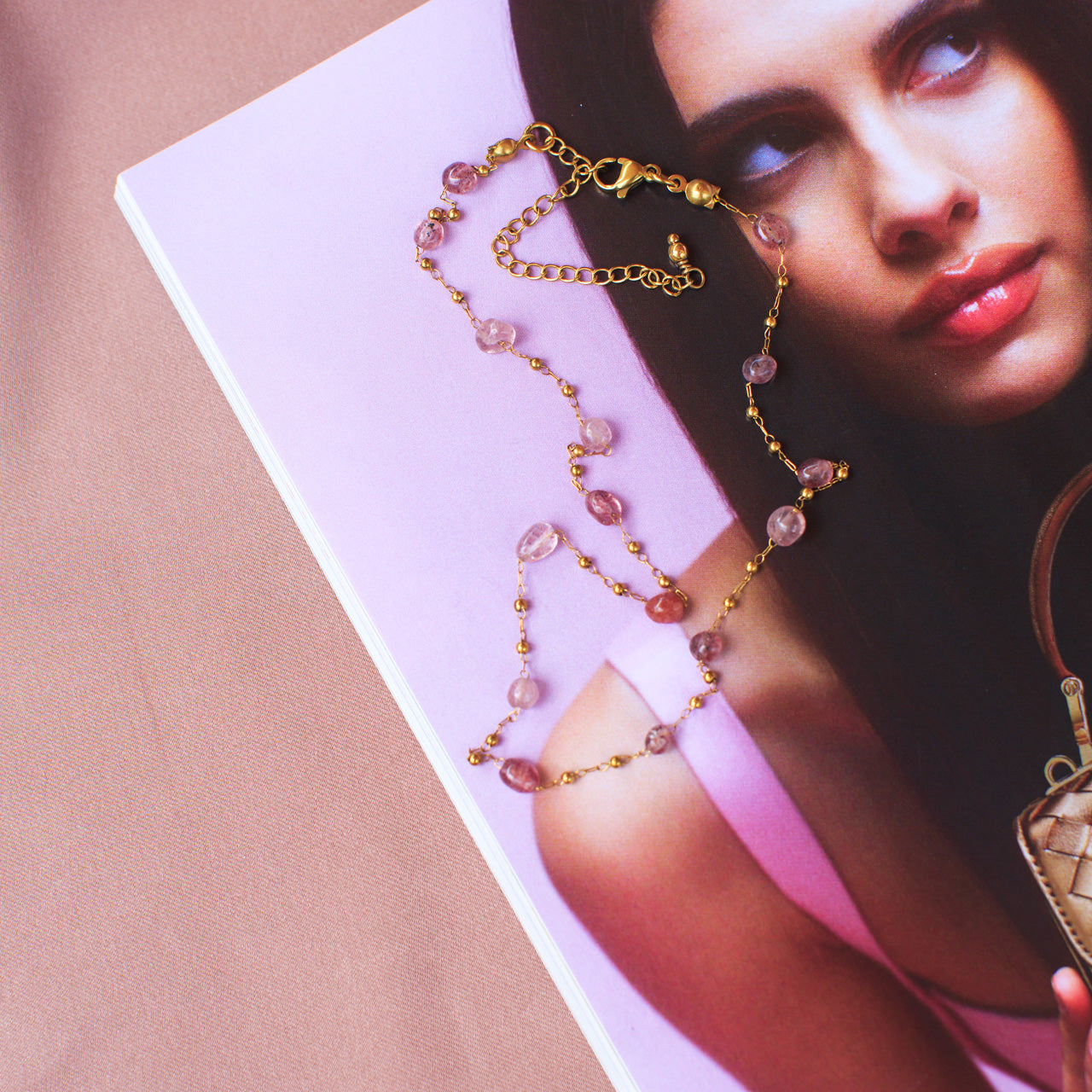 Złote kuleczki i delikatny łańcuszek dodają kompozycji lekkości, a zarazem eleganckiego kontrastu, który podkreśla unikatowość każdego kamienia. Kwarc strawberry znany jest jako kamień miłości, wdzięczności i wewnętrznej harmonii - wspiera serce, łagodzi stres i przyciąga dobre, pełne czułości energie.