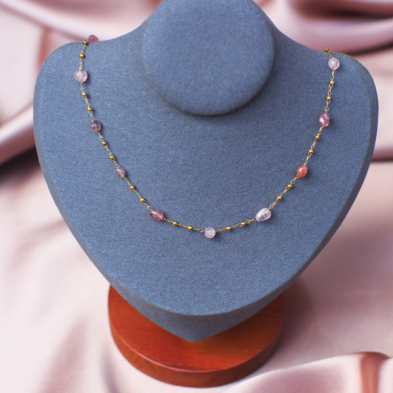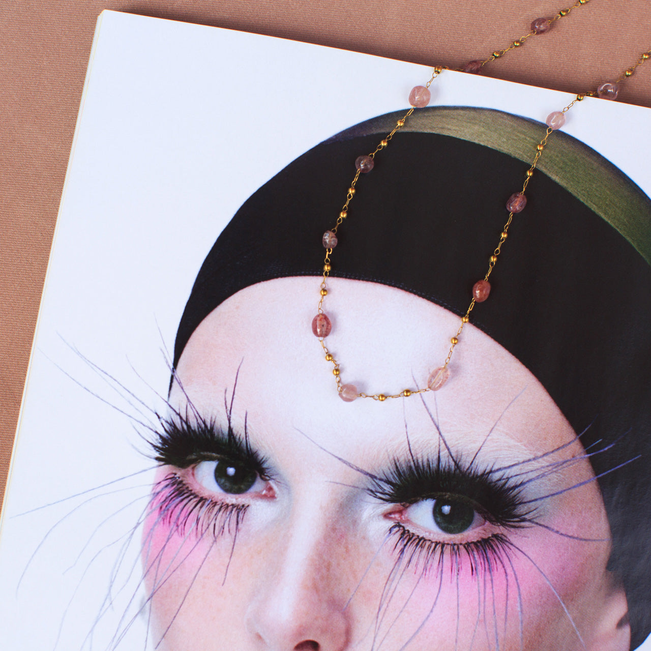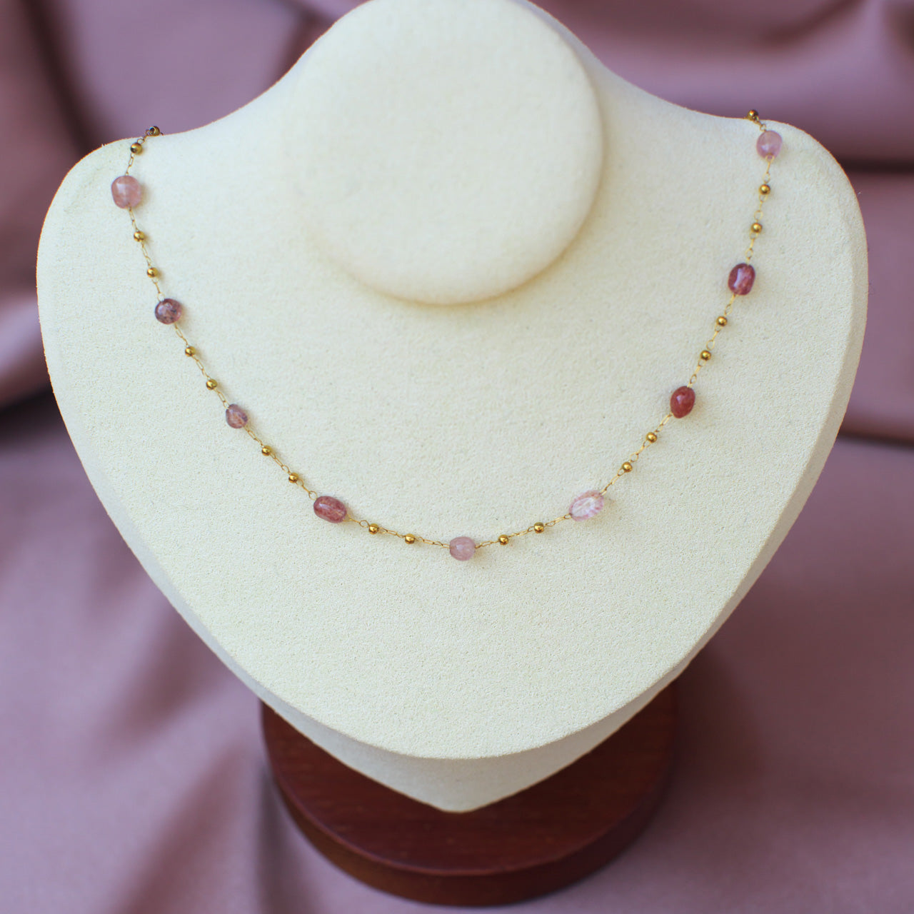 Złote kuleczki i delikatny łańcuszek dodają kompozycji lekkości, a zarazem eleganckiego kontrastu, który podkreśla unikatowość każdego kamienia. Kwarc strawberry znany jest jako kamień miłości, wdzięczności i wewnętrznej harmonii - wspiera serce, łagodzi stres i przyciąga dobre, pełne czułości energie.