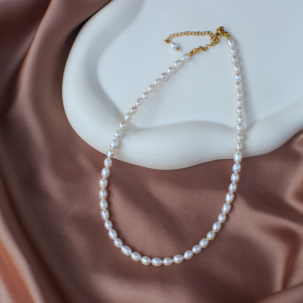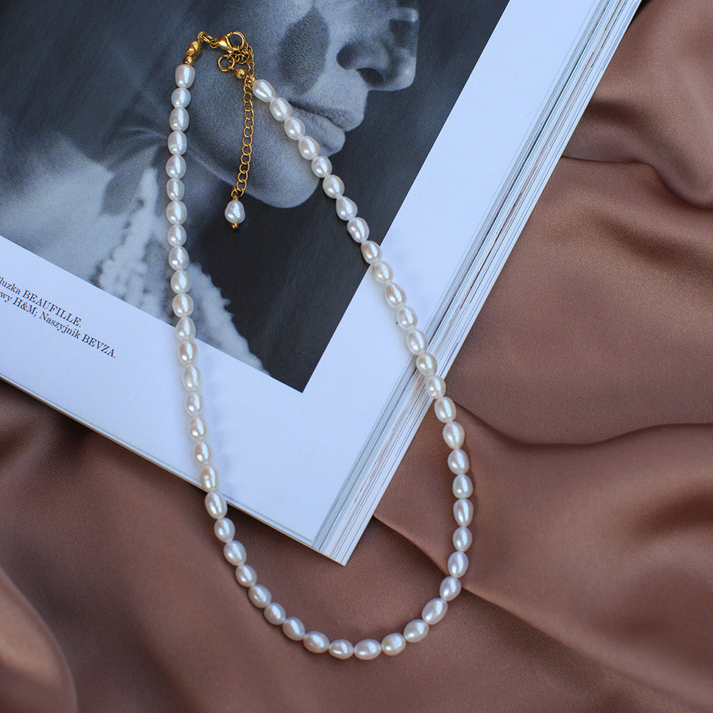 Delikatny i subtelny naszyjnik wykonany z naturalnych pereł słodkowodnych typu „ryż” o wielkości 4,5–5 mm. Perełki mają charakterystyczny, podłużny kształt i subtelny połysk, który pięknie odbija światło, dodając elegancji każdej stylizacji. Dzięki klasycznej formie i lekkiej konstrukcji naszyjnik doskonale sprawdzi się zarówno na co dzień, jak i na specjalne okazje.